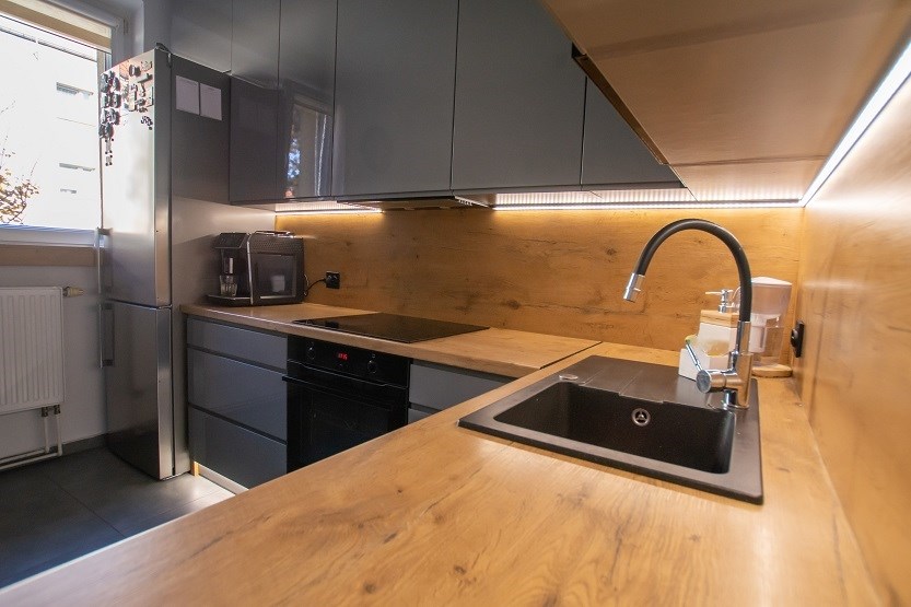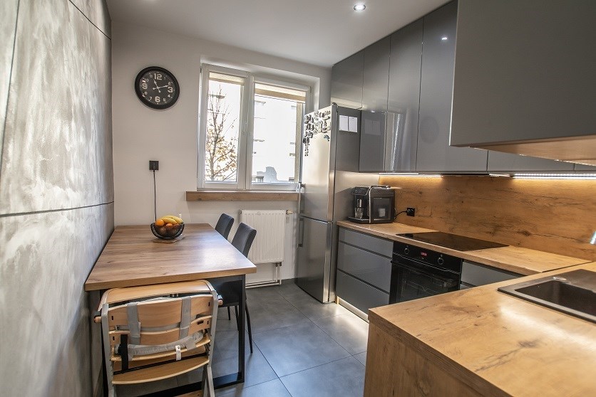 • Kuchnia po remoncie z nowoczesną zabudową i AGD
