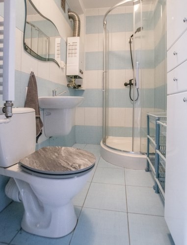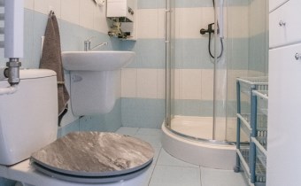 - łazienka w kafelkach starszego typu z kabiną prysznicową