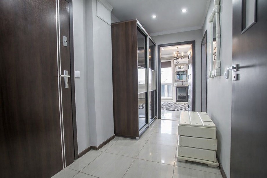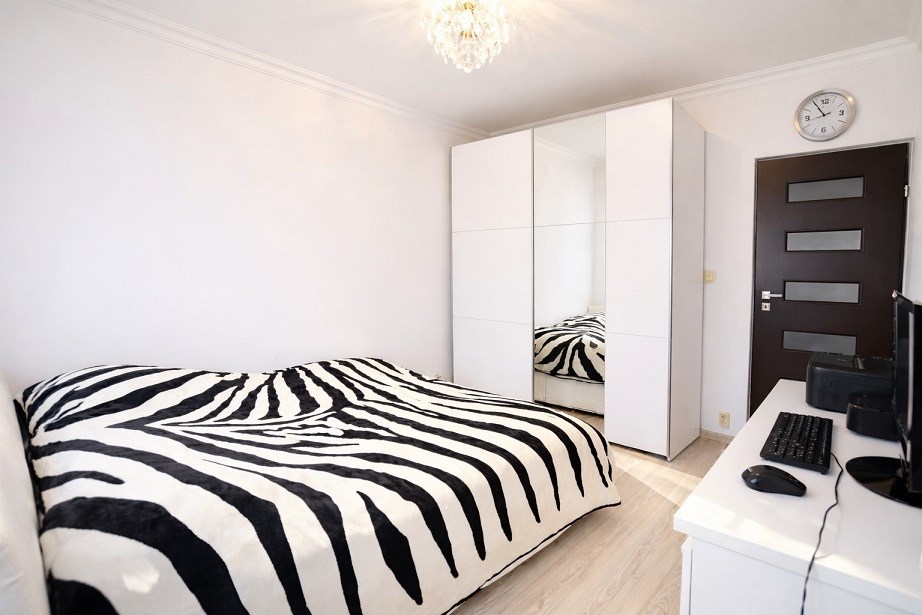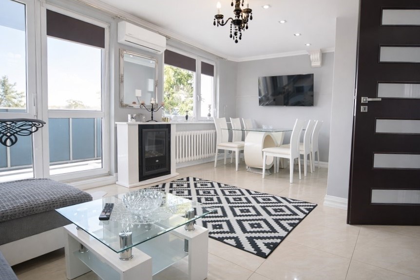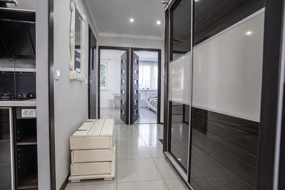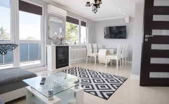 W mieszkaniu zastosowano okna PCV, na ścianach położono gładzie, a na podłogach panele oraz płytki, co tworzy estetyczną i neutralną bazę. Dla pełnego komfortu mieszkańców, w salonie zamontowano klimatyzację.
