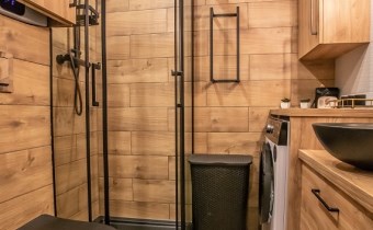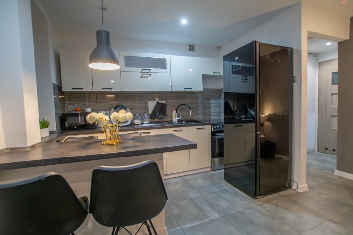 - kuchnia w zabudowie ze sprzętem AGD: kuchenka gazowa z piekarnikiem, lodówka z zamrażarką, zmywarka,